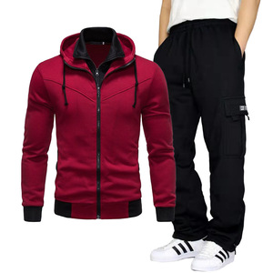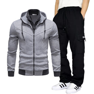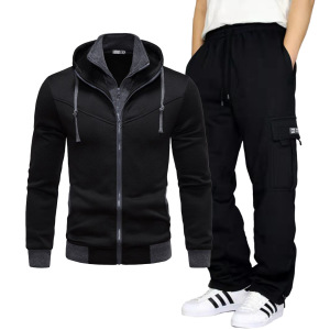 新款春秋季运动拼接外套休闲长袖工装长裤连帽运动男式套装两件套