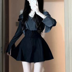 吊带衬衫上衣高腰黑色字短半身连衣裙子女秋季2025新款辣妹套装