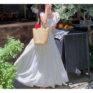 白色连衣裙女夏季2025新款长款收腰方领荷叶边一字肩飞飞袖a字裙