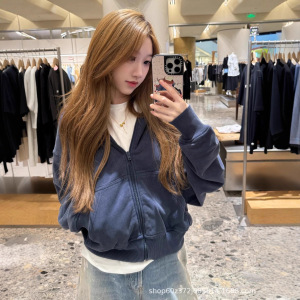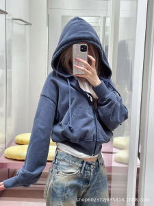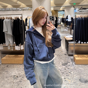 2025早秋新款 北欧小众 蓝色做旧短款连帽拉链宽松长袖卫衣外套女