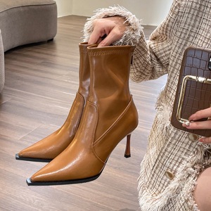 棕色尖头高跟短靴女春秋单靴2025年拼接细跟瘦瘦裸靴