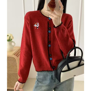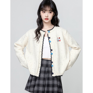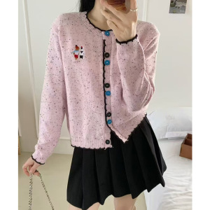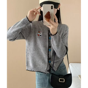 韩系复古撞色圆领针织开衫女2025春秋季新款宽松短款毛衣外套上衣