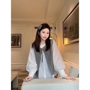 2025春秋新款宽松叠穿背心外套毛衣女圆领系带外搭短款毛针织马甲