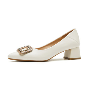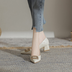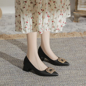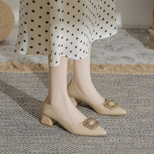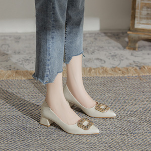 真皮粗跟单鞋女鞋新款春秋低跟尖头浅口法式软皮水钻中跟瓢鞋大码