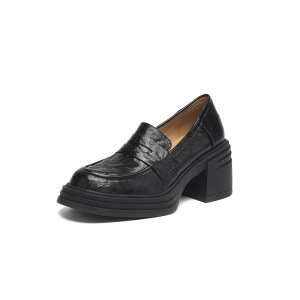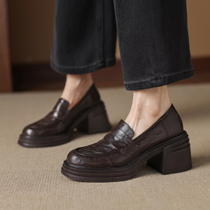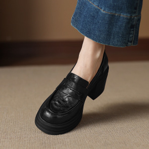 静音底舒适不累脚增高厚底头层羊皮乐福鞋2025粗高跟圆头真皮单鞋