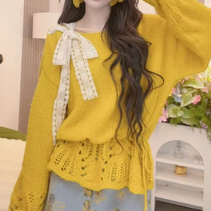 氛围感甜美慵懒风针织2025秋季新款蝴蝶结拼接蕾丝绑带温气质上衣