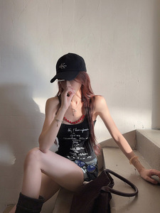 街区焦点 美式辣妹设计感印花吊带背心女装修身显瘦露背上衣夏季