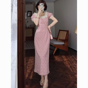 大码胖mm法式复古花边红格爱心碎花连衣裙女夏季收腰遮肚显瘦长裙