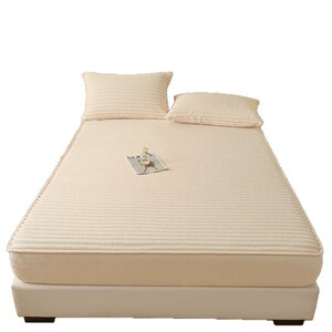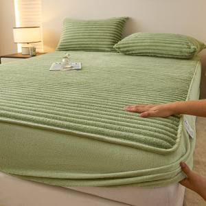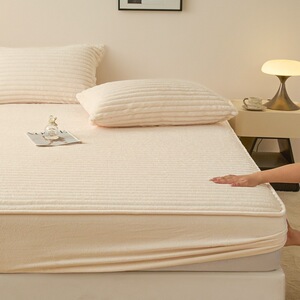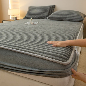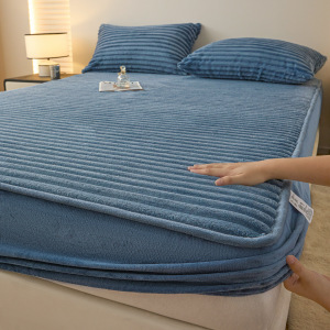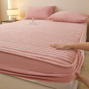 跨境秋冬兔毛绒抽条床笠三件套全包加厚床罩珊瑚绒保暖床垫保护套
