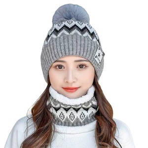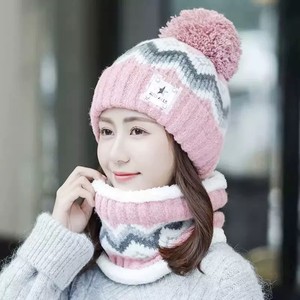 秋冬季加厚加绒保暖针织毛线帽子围脖套装女学生骑车毛球护耳套帽