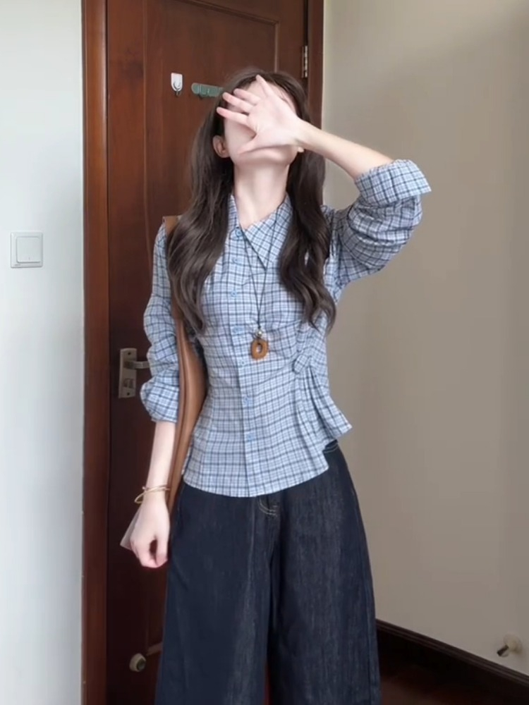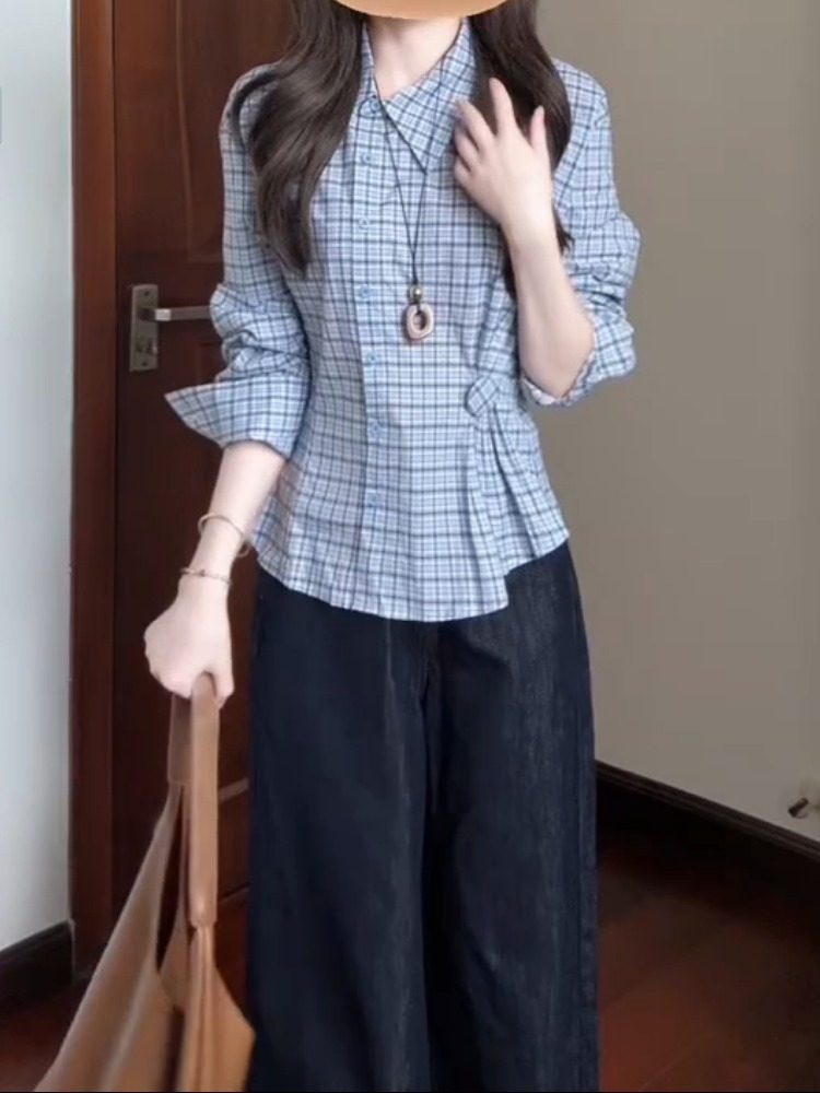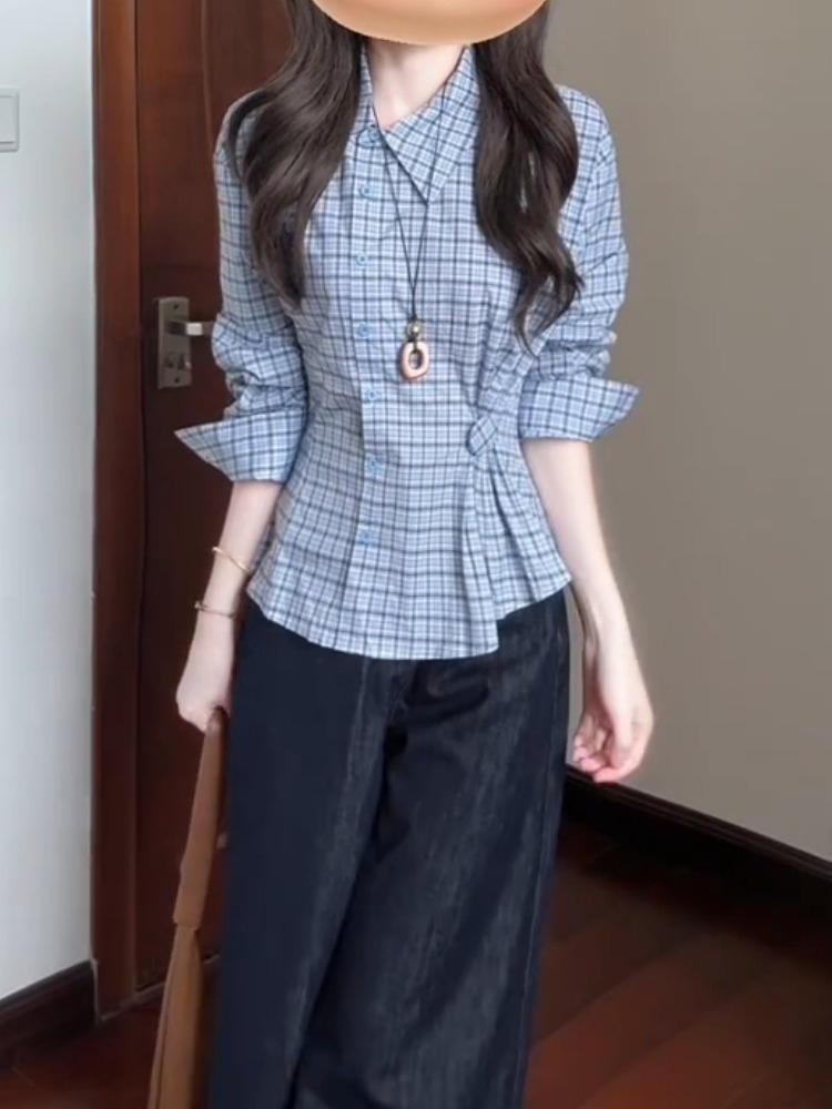 轻职场通勤穿搭时尚洋气时髦轻奢感蓝色格纹收腰长袖衬衫女秋2025