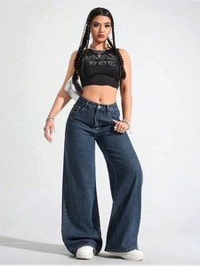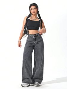欧美跨境新款高腰显瘦垂感宽松拖地直筒裤子蓝灰色阔腿牛仔裤女
