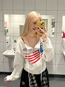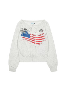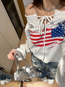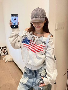 辣妹美式显瘦复古运动印花拉链开衫一字斜肩卫衣休闲长袖上衣外套