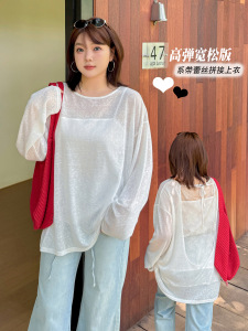 k3118大码女装圆领长袖微透T恤衫打底衫蕾丝胖妹妹300斤上衣