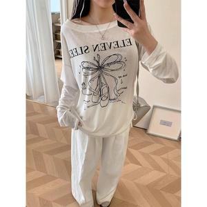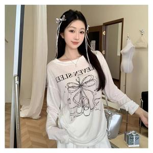 慵懒风薄款印花斜肩长袖T恤女夏季微透宽松显瘦罩衫