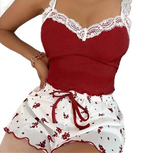 欧美花色睡衣女夏季新款甜美可爱三套装松紧腰系带吊带短裤家居服
