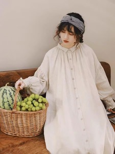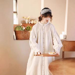 秋上新日系女装娃娃裙森系甜美翻领连衣裙棉麻褶皱文艺复古森女风