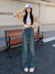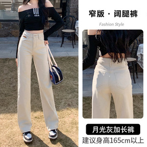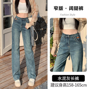 水泥灰窄版阔腿牛仔裤女秋季2025新款高腰九分小个子直筒烟管裤子