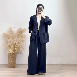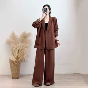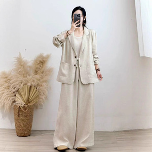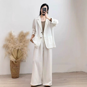 2025秋款砂洗亚麻纯色女套装 长袖西装外套+宽松微喇系带休闲长裤