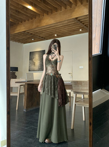 蕾丝拼接飘带领吊带连衣裙女夏季设计感收腰裙子修身纯欲字长裙