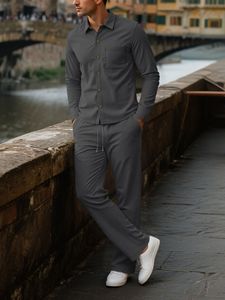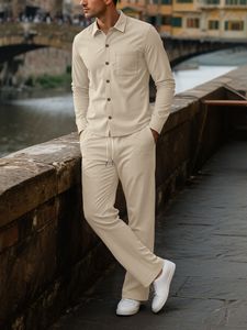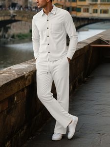 亚马逊欧美跨境新款灯芯绒男士四季休闲排扣衬衫开衫长袖长裤套装