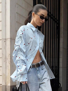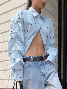 俄罗斯爱心印花翻领衬衫女2025秋季速卖通设计感抽褶衬衣批发女装