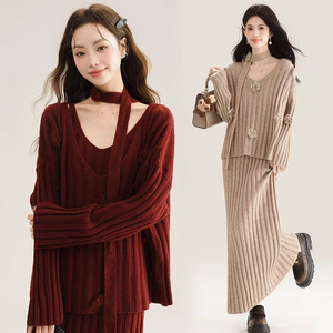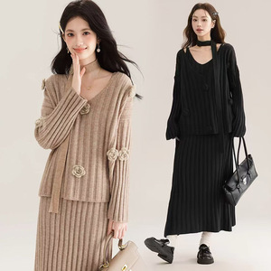 2025秋冬孕妇法式新款高级设计针织v领挂脖哺乳上衣+半身裙两件套