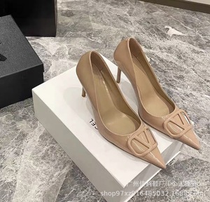 V扣高跟凉鞋女细跟通勤浅口单鞋气质名媛高跟鞋尖头裸色高跟单鞋