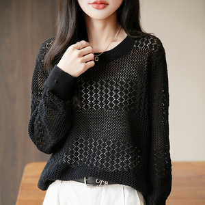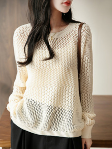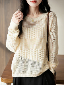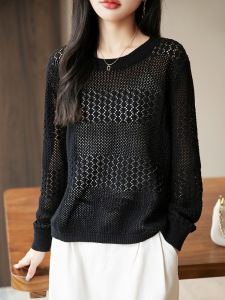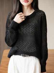2025年早秋新款纯棉线圆领针织衫长袖女纯色宽松镂空钩花打底衫