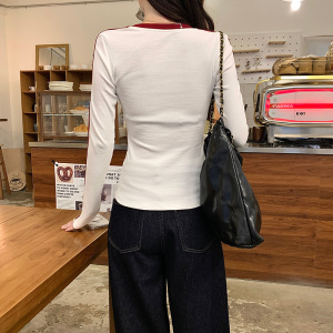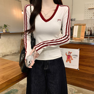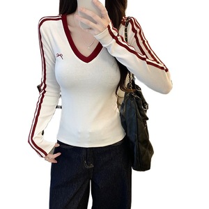 实拍长袖t恤女装春秋薄款2025秋季新款撞色短款修身打底衫V领上衣
