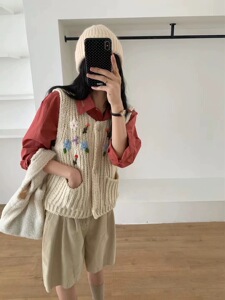韩系绣花无袖针织毛衣马甲开衫女秋季设计感小众内搭保暖洋气上衣