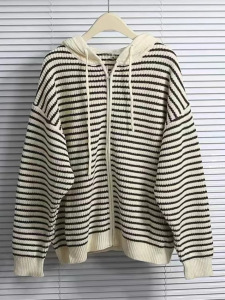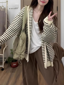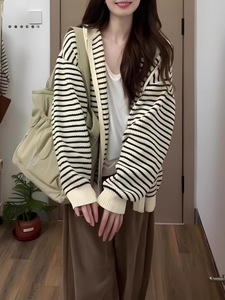 跨境抽绳连帽条纹毛衣女秋冬韩版宽松慵懒风休闲针织开衫上衣外套