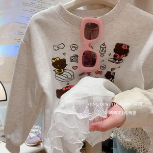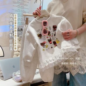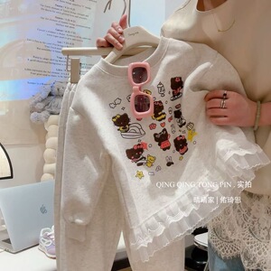 女童蕾丝拼接花边卡通卫衣套装2025秋季新款韩版纯色印花运动裤子