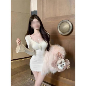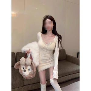 秋冬纯欲风法式领长袖连衣裙女新款休闲设计感蕾丝包臀打底短裙