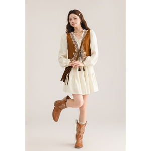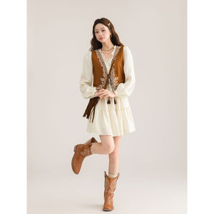 uj么宁秋季上新复古减龄气质套装民族风刺绣马甲连衣裙两件套sd