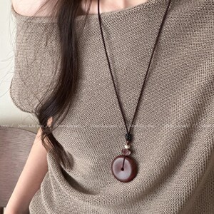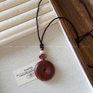 新中式国风檀木平安扣吊坠项链女编织绳长款毛衣链复古简约配饰品
