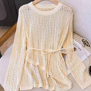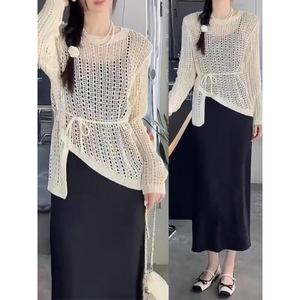 长袖时尚套装裙女年春秋季新款慵懒风镂空针织衫吊带裙两件套