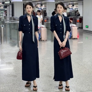 时尚连衣裙女2025秋季新款亚马逊气质百搭简约复古长款假两件裙子