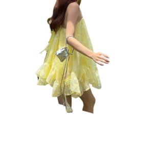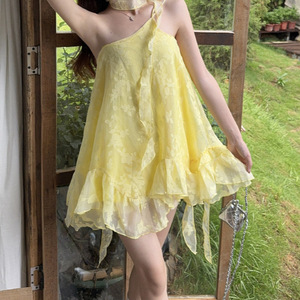 法式黄色不规则挂脖斜肩连衣裙海边度假小个子巨好看沙滩蓬蓬短裙