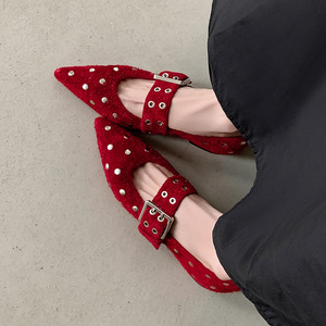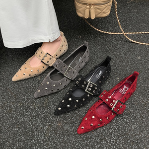 复古铆钉平底芭蕾舞鞋女2025秋季新款尖头浅口一字扣带玛丽珍单鞋