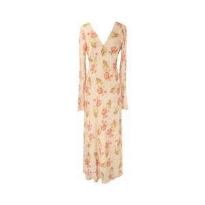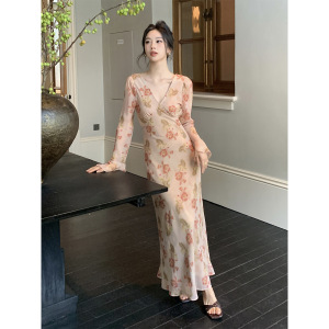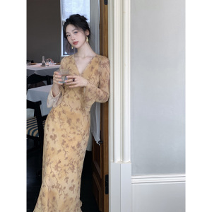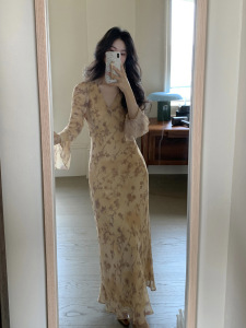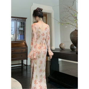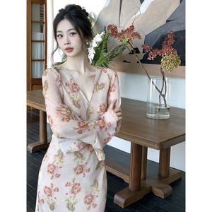 【弥纱】SYT自制 温柔仙美v领喇叭袖花朵连衣裙女秋新款印花长裙