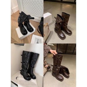 增高6cm~时髦皮带扣方圆头褶皱中筒骑士靴女2025年秋季新款长筒靴