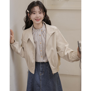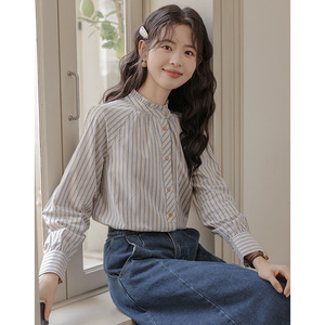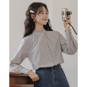 法式木耳边领蓝色条纹衬衫女长袖学院风百搭修身打底衬衣上衣包邮