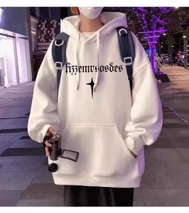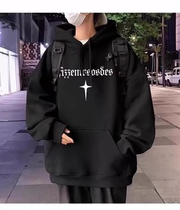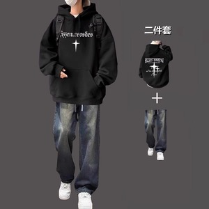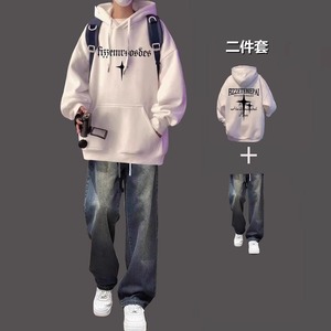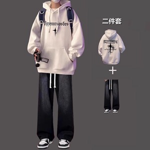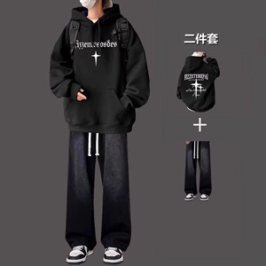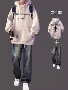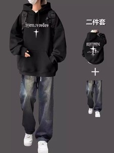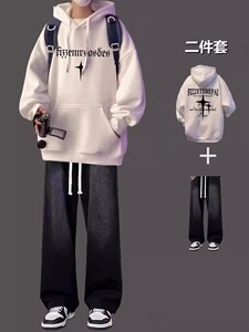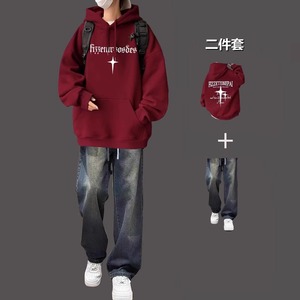 酒红色连帽卫衣新年套装秋冬痞帅港风男装学生潮流一套搭配牛仔裤
