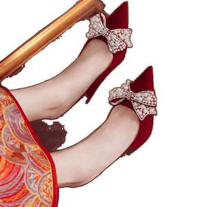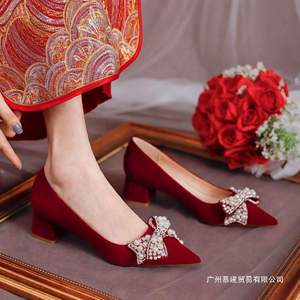 红色高跟鞋女胖脚宽喜宴婚鞋尖头单鞋粗跟水晶鞋敬酒鞋大码41一42