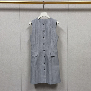 法式小众2025早秋饰钻竖条纹无袖圆领单排扣连衣裙女