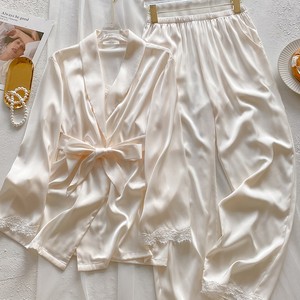 真丝睡衣女春夏秋款桑蚕丝莼色吊带长裤睡袍三件套家居服薄款