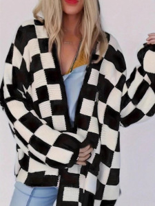 秋冬跨境亚马逊欧美休闲宽松女装外套长袖黑白格女士毛衣开衫
