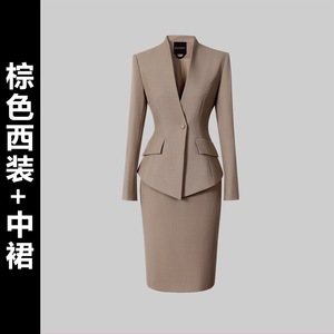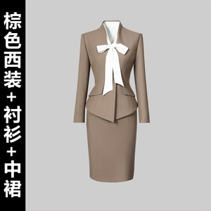 棕色西装+衬衫+中裙