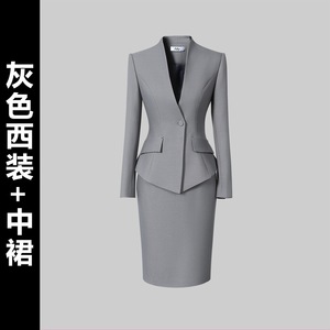 灰色西装+衬衫+中裙